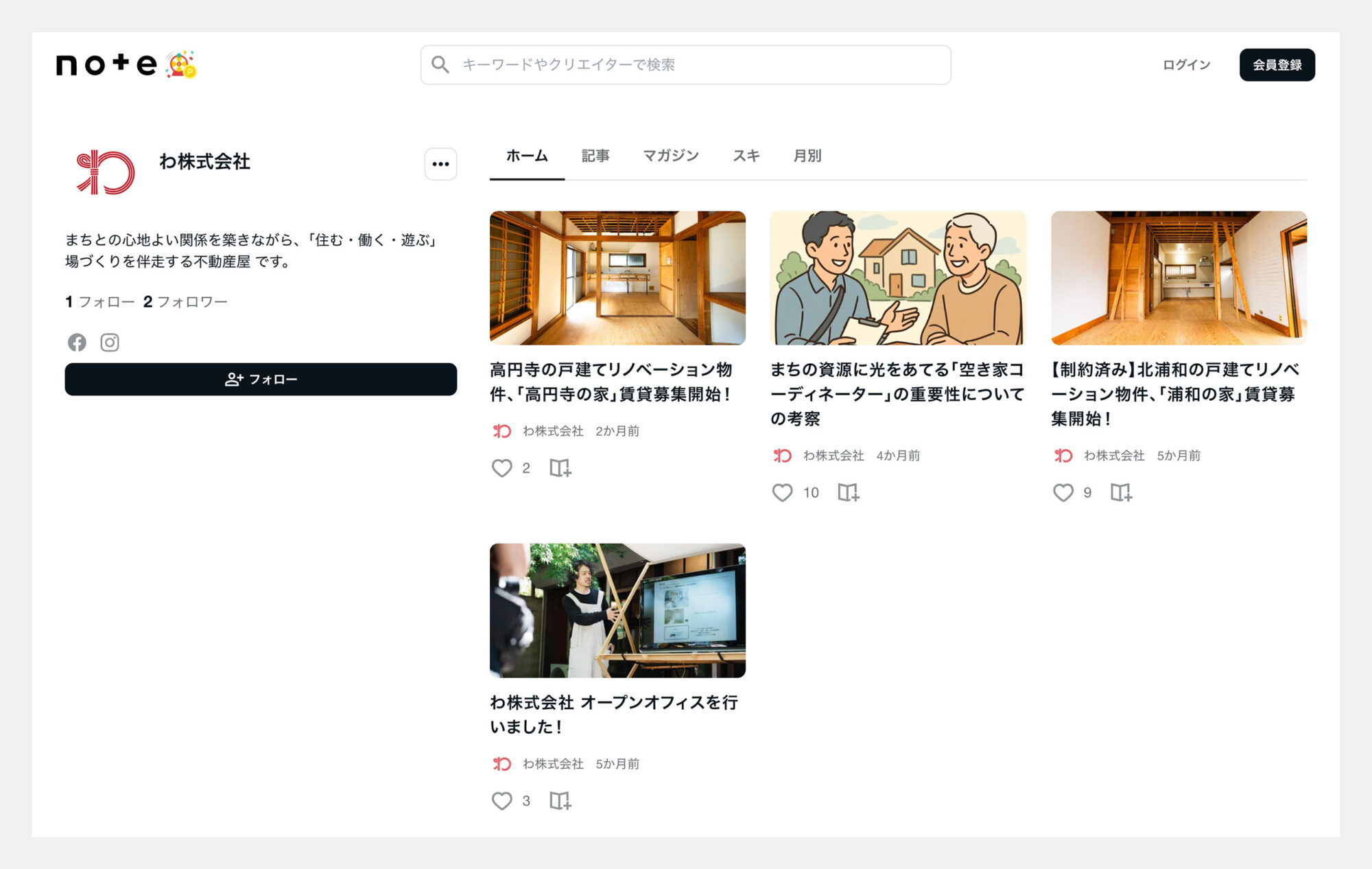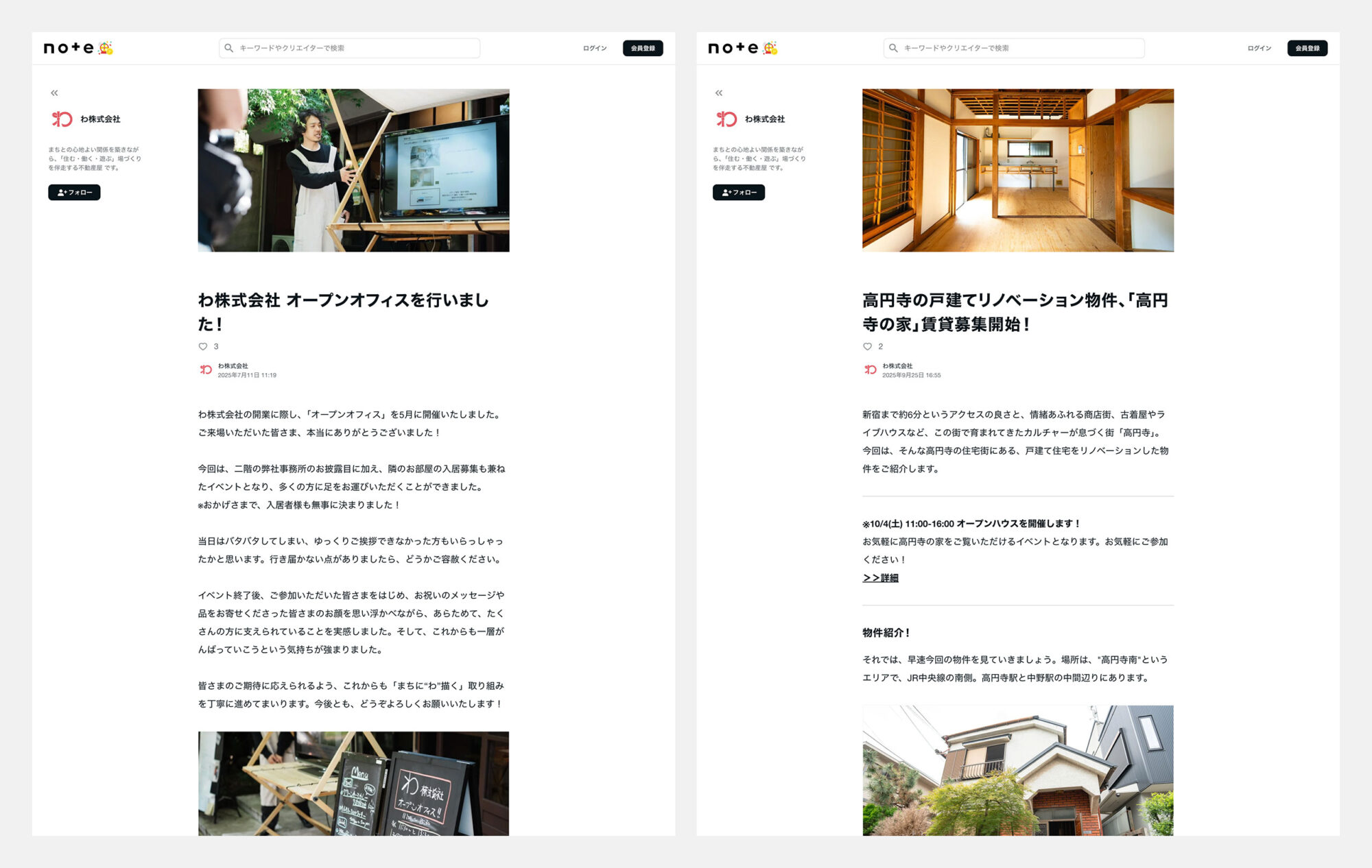 わ株式会社のnoteでは、物件の入居者募集記事や、日々の考えごとなどのコラムのほか、読み物としてお楽しみいただけるような記事を公開しております。
